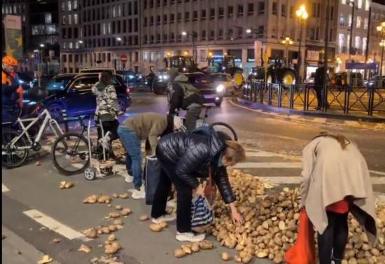 2025年12月18日,在比利时布鲁塞尔,一些市民捡拾示威者遗弃的土豆(视频截图)。新华社发