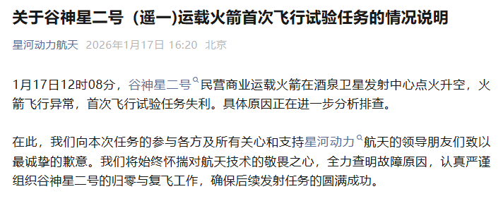 1月17日12时08分,谷神星二号民营商业运载火箭在酒泉卫星发射中心点火升空,火箭飞行异常,首次飞行试验任务失利。具体原因正在进一步分析排查。
