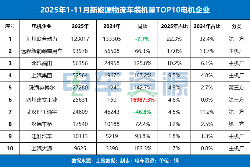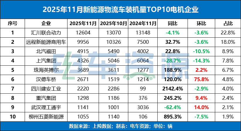 从月度数据来看,新能源物流车电机装机量受整车销量波动影响明显。2025年11月,行业整体装机量应声回落,同比下降。从当月装机量TOP10企业数据可见,头部企业格局相对稳定,汇川联合动力、远程新能源商用车、北汽福田稳居前三,2025年11月装机量分别为12604辆、9956辆、4915辆,占比依次达到22.8%、18.0%、8.9%,三者合计占比超五成,头部聚集效应显著。