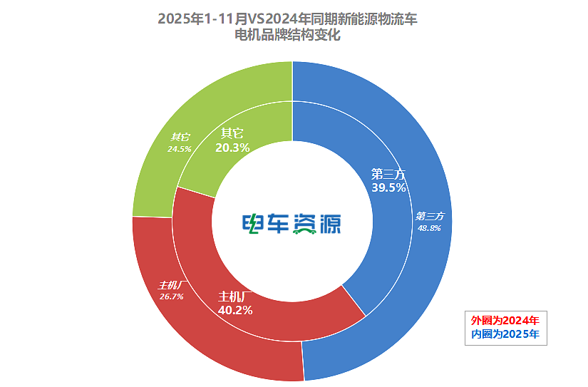 2025年1-11月,新能源物流车电机市场最核心的变化在于品牌结构的历史性重塑。从品牌结构变化图表可见,2024年同期,第三方品牌电机装机量占比高达48.8%,主机厂品牌占比仅为26.7%;而到2025年1-11月,这一格局彻底反转好牛,主机厂品牌占比飙升至40.2%,第三方品牌占比则降至39.5%,主机厂品牌实现首次反超。